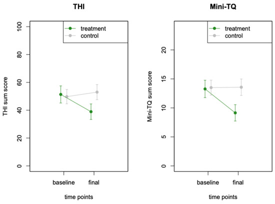 Changes in the THI and Mini-TQ in both groups and at both timepoints are visualised in Figure 3.