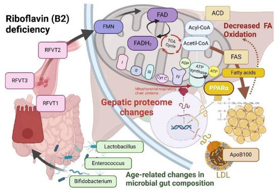 Pathogenetic insights into the association between vitamin B2 and MS. The gut microbiota responsible for riboflavin synthesis in humans includes specific strains of Bifidobacterium and Lactobacillus. Aging is associated with a decline in these beneficial bacteria, while individuals with type 2 diabetes mellitus (T2DM) show reduced Lactobacillus spp., correlating with insulin resistance. A Bifidobacterium strain has been shown to reduce obesity-related dyslipidemia in murine models. Moreover, the prevalence of gut Enterobacteriaceae increases with age, independent of genetic or lifestyle factors, contributing to aging through disruption of cellular pathways and mitochondrial dysfunction. Riboflavin absorption occurs in the small intestine via the RFVT1 and RFVT3 transporters, with RFVT2 present in the brain. Riboflavin deficiency induces overexpression of RFVT transporters in cardiomyocytes, indicating an adaptive response for maintaining riboflavin homeostasis. Riboflavin is essential for the synthesis of FAD and FMN, crucial cofactors for mitochondrial flavoproteins involved in the respiratory chain and β-oxidation enzymes necessary for energy production. In riboflavin-deficient rats, Apolipoprotein B100 mRNA and protein levels were significantly reduced compared to controls, highlighting the role of ApoB100 in lipid transport and its association with VLDL and LDL. Additionally, riboflavin deficiency in Pekin ducks markedly affects liver protein profiles, with decreased proteins linked to fatty acid β-oxidation and mitochondrial electron transport, while proteins associated with triacylglycerol and cholesterol synthesis are elevated. Furthermore, mice deficient in vitamin B2 exhibit reduced activation of PPARα target genes, which are critical for gluconeogenesis, suggesting that vitamin B2 deficiency impairs glucose production during fasting.