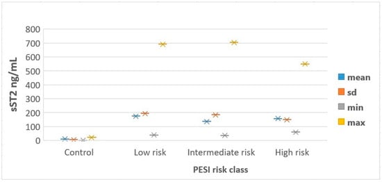 Distribution of sST2 levels according to PESI risk classes. PESI—Pulmonary Embolism Severity Index; sd—standard deviation; sST2—soluble Suppression of Tumorigenicity 2.