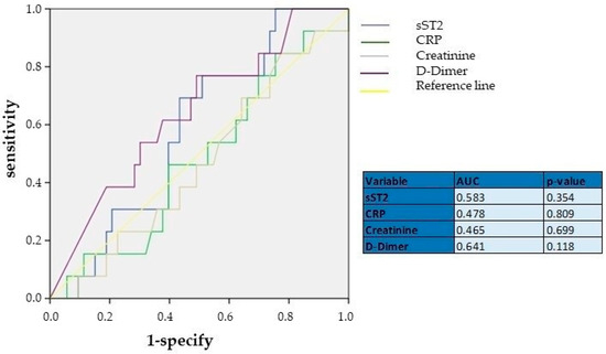 ROC curve analyses showing the diagnostic performance of sST2, CRP, creatinine, and D-dimer. AUC—area under curve; CRP—C-reactive protein; sST2—Suppression of Tumorigenicity.