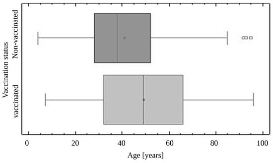 Median age in two groups of patients: non-vaccinated and vaccinated.