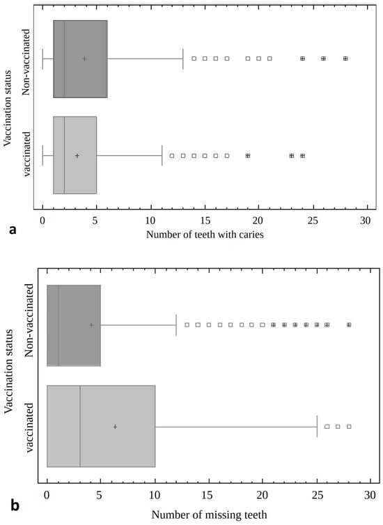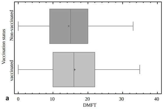The comparison of non-vaccinated patients and vaccinated patients with regard to DMFT indicator (a) and Dental Treatment Index (b). DMFT indicator: D—number of decayed teeth; M—number of extracted teeth due to caries; and F—teeth with dental fillings.