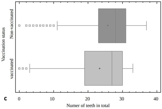 The comparison of non-vaccinated and vaccinated patients with regard to the of number of teeth with caries (a), number of missing or extracted teeth (not including wisdom teeth) (b), and number of total teeth (c).