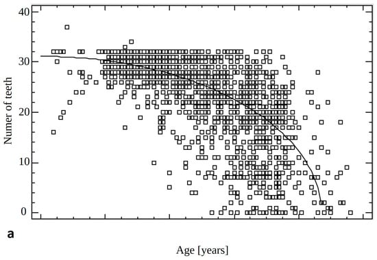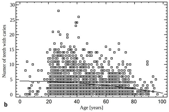 With age, an increase in the number of filled teeth was noted until the age of 30, after which it remained constant. At the same time, a steady exponential increase in the number of lost teeth was observed above the age of 30 up to which it remained relatively constant. DMFT, on the other hand, showed a logarithmic increase. The first increase in the DMFT index occurs during adolescence, while it increases much later in adults [19], which has been proven in many studies. Our study also confirmed this thesis. One can see a significant increase in the DMFT index among the elderly, which increases with age. Due to the development of caries in the crowns of teeth and roots, there is a need for fillings or the extraction of teeth due to caries.