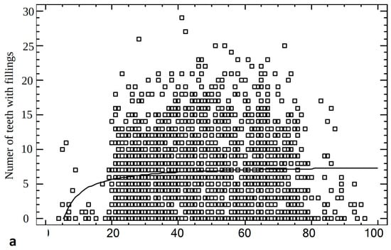 Results for the number of teeth with dental fillings (a), number of missing teeth/extracted teeth (not including wisdom teeth) (b), and the DMFT indicator (c) in correlation with age of patients. DMFT indicator: D—number of decayed teeth; M—number of teeth extracted due to caries; F—teeth with dental fillings.