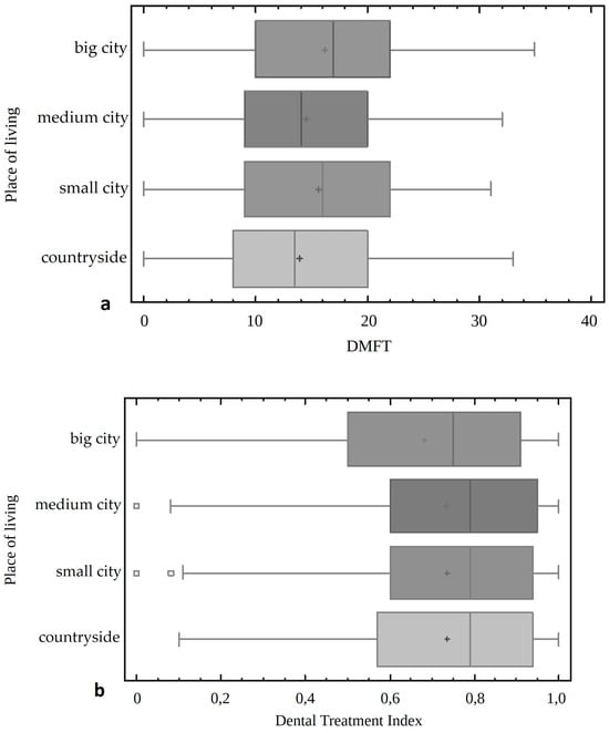 The comparison of the DMFT indicator (a) and the Dental Treatment Index (b) in people from different places of living.
