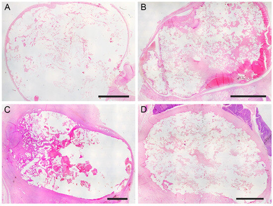The subjects sampled at 7, 30, and 90 days post-surgery did not exhibit symptoms related to a painful state or signs of side effects after aneurysm embolization. During the surgery for removing the experimentally induced defects, no alterations due to an ongoing inflammatory process were evidenced (Figure 2C). The mean long × short diameters of the created aneurysm ranged from 5 to 30 mm (mean diameter 12.4 mm ± 6.2 mm). The mean neck width ranged from 3 to 10 mm. The dome-to-neck ratio (long diameter/neck width) ranged from 1 to 3. A complete occlusion was observed starting from time 0 (Figure 3A) and remained evident at 7 (Figure 3B), 30 (Figure 3C), and 90 (Figure 3D) days post-surgery. The aneurysm occlusion was due to a mixture of the embolic agent and thrombotic materials. The distribution of the embolic material inside the embolic cast was homogeneous, and the embolizing material adhered to the aneurysm wall. There was no evidence of recanalization of the embolic cast in samples examined, particularly after 7, 30, and 90 days post-surgery.