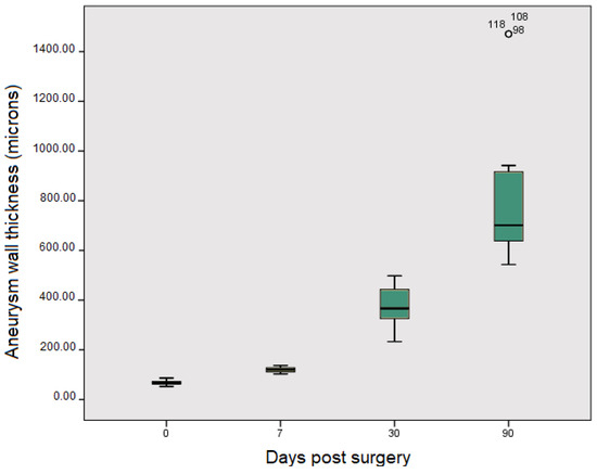 Aneurysm wall thickness at different times after embolization.