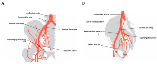 - Almaguer, J.; Murray, D.; Murray, M.; Murray, R. Differentiating Between Obturator and Inferior Epigastric Arterial Injury in Traumatic Pelvic Hemorrhage: A Case Report. Cureus 2023, 15, e44593. [Google Scholar] [CrossRef]