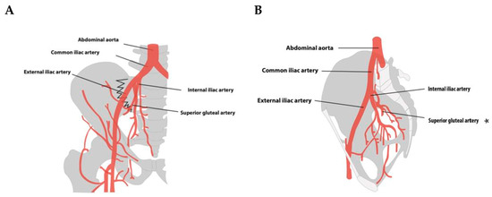 - Gómez-Puerta, J.A.; Peris, P.; Llusá, M.; Guañabens, N. Sacral stress fracture as a cause of gluteal artery injury: An unusual complication of a common fracture. Jt. Bone Spine 2008, 75, 239–241. [Google Scholar] [CrossRef] [PubMed]
