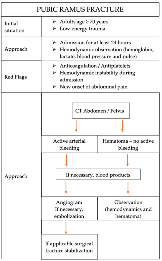 - Macdonald, D.; Tollan, C.; Robertson, I.; Rana, B. Massive haemorrhage after a low-energy pubic ramus fracture in a 71-year-old woman. Postgrad. Med. J. 2006, 82, e25. [Google Scholar] [CrossRef]