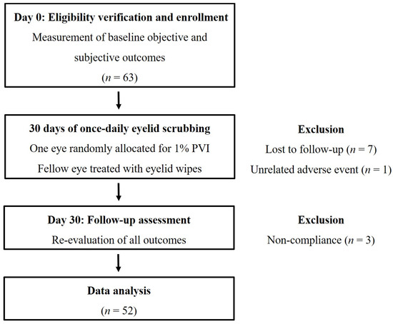 Before treatment initiation, best-corrected visual acuity, intraocular pressure, and dilated fundus examinations were performed to rule out underlying ocular pathologies. The patients received a sealed envelope that indicated which eye was allocated for treatment with 1% PVI and were instructed to treat the fellow eye with eyelid wipes. Each participant received detailed instructions on the scrubbing process. Patients were contacted two weeks into the treatment to verify their compliance and adherence to the instructions provided. The examiner was masked from treatment allocation. After 30 days of treatment, the subjects returned for a follow-up assessment, in which the same masked examiner (E.A.) re-evaluated all subjective and objective outcomes. Once all data were collected, each patient revealed which eye had been treated with 1% PVI.