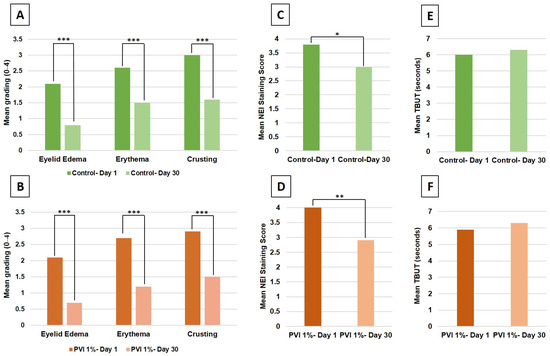 Objective outcomes in the 1% PVI and control groups after 30 days. (A,B) The severity of blepharitis signs (0–4 Efron scale) on slit-lamp exam. (C,D) Corneal staining according to the NEI grading system (0–15 points). (E,F) TBUT (seconds). Means of baseline vs. day 30 findings were compared using a two-tailed paired Student’s t-test. Error bars represent the standard deviation. * p < 0.05, ** p < 0.01, *** p < 0.001. NEI = National Eye Institute; TBUT = tear breakup time.