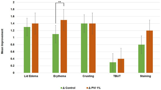 Paired-eye comparisons of improvements in objective outcomes. Means of improvement values in the 1% PVI group vs. the control group were compared using a two-tailed paired Student’s t-test. Error bars represent the standard deviation. ** p < 0.01. TBUT = tear breakup time.