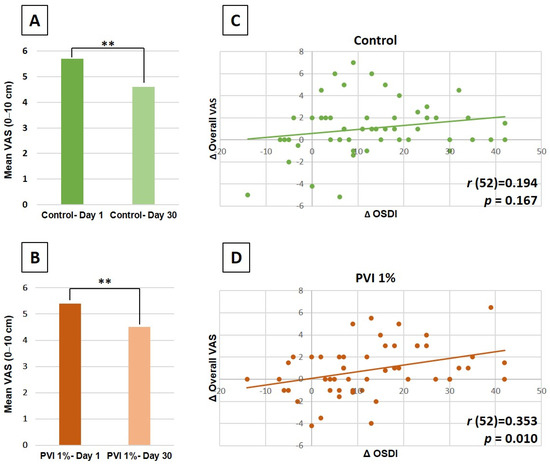 On day 30, there was a significant reduction in the mean OSDI score compared to the baseline score (12.0 vs. 25.0, respectively, p < 0.001). Both treatment groups exhibited lower mean VAS scores for overall ocular surface discomfort (Figure 4A,B: 1% PVI, from 5.4 to 4.5, p = 0.009; control, from 5.7 to 4.6, p = 0.003). The mean reduction in VAS score was not significantly different between the 1% PVI and control groups (0.9 vs. 1.1, respectively, p = 0.520). However, the changes in the OSDI score were positively correlated with the improvements in VAS scores only in the 1% PVI group (Figure 4C,D, r (52) = 0.353, p = 0.01).