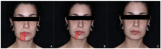 All patients who met the inclusion criteria were referred to a PBM appointment. A clinical history was performed, and the exclusion criteria were applied. Subgroups were created according to the underlying injury etiology. The presence of any specific symptoms of IAN damage (e.g., paresthesia, hypoesthesia, anesthesia, dysesthesia) was recorded and monitored in the subsequent appointments. Furthermore, a physical assessment to evaluate the sensory deficit was conducted, comprising a pinprick test and mapping of the affected region. During the procedure, the patient’s eyes were kept closed, and a sharp dental probe was placed in direct contact with the labial and mental skin, with the operator applying light pressure. Subsequently, the patient was requested to identify and touch the probed area. The surface was considered affected if the pinprick point was misidentified or not identified. Following the mapping, the area was calculated and expressed in cm2, with the value obtained rounded up to the nearest whole number (Figure 1). The contralateral non-affected side was used as a control. The process was repeated at the beginning of each consultation. HRQoL was assessed using the Portuguese version of the EQ-5D-5L [] at the first and last visits. Satisfaction with treatment and likelihood to recommend treatment were likewise evaluated using an 11-point Likert scale after the patient’s discharge.