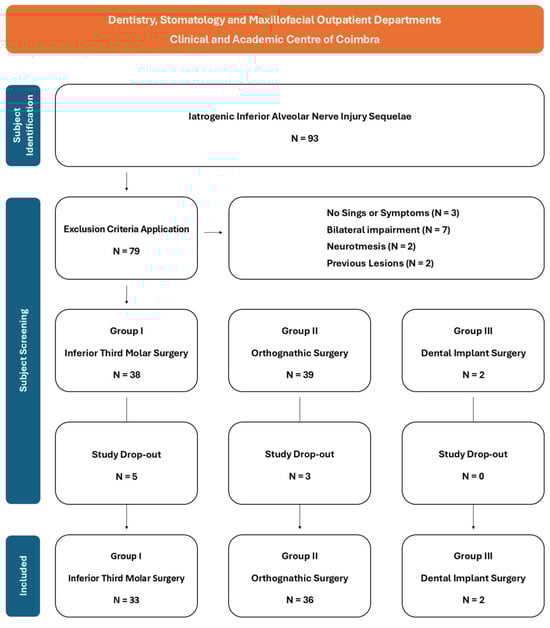 From 1 July 2022 to 30 June 2024, 93 patients with persistent (>8 weeks) iatrogenic IAN injuries were referred for PBM appointments. Applying the exclusion criteria, 14 patients were disqualified from this study. The remaining 79 patients were divided into 3 cohorts according to etiology: 38 patients in Group I—Inferior Third Molar Surgery; 39 patients in Group II—Mandibular Orthognathic Surgery (all BSSO); and 2 patients in Group III—Dental Implant Surgery. A total of 71 subjects completed the study, following the exclusion of 8 dropouts (5 patients in Group I—Inferior Third Molar Surgery; 3 patients in Group II—Mandibular Orthognathic Surgery) (Figure 3). Sample characteristics according to the attributed group are displayed in Table 1.