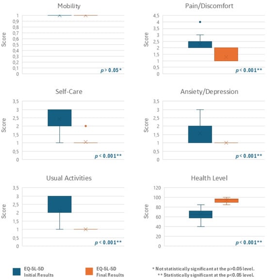 Similarly, patients’ HRQoL showed a meaningful improvement in all groups between the two assessment points in four dimensions of the EQ-5D-5L questionnaire: self-care, usual activities, pain/discomfort, and anxiety/depression. However, the fifth dimension, related to mobility, remained unchanged (Figure 4 and Figure 5). Patients’ perceived health, as measured by the EQ-VAS, also showed a notable improvement, with the mean score increasing by 28.94 (Group I), 25.33 (Group II), and 37 (Group III) points from the beginning to the end of the study (Figure 4 and Figure 5). These results demonstrate statistically significant differences (p < 0.001) as determined by the Wilcoxon Test, in groups I and II, accompanied by a relevant effect size (Table 2 and Table 3).