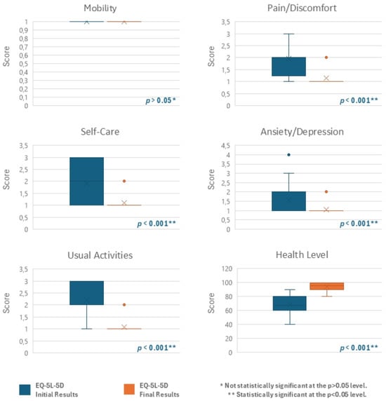 EQ-5D-5L questionnaire initial and final results—Group I (Vertical Boxplot Chart).