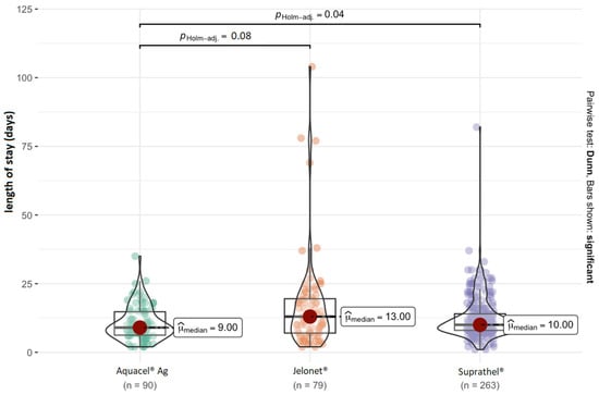 Length of hospitalization depending on the type of dressing (median, p values and density distribution).