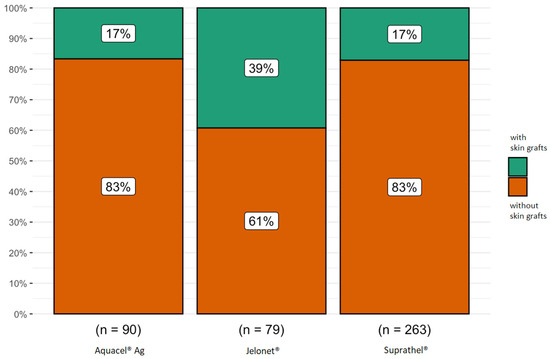 Skin grafts depending on the type of dressing (% of study group with and without skin transplantation).