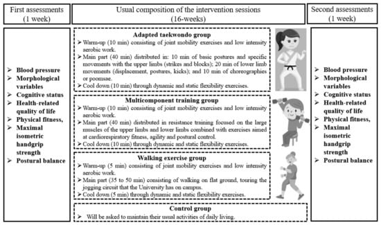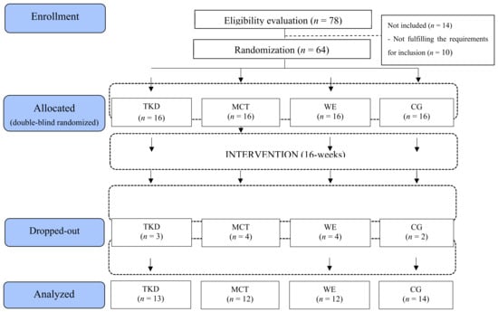 Additionally, the interventions using TKD in randomized controlled trials have had positive effects on physical performance and HRQoL variables compared to an inactive CG [5,6,7] and conventional physical activity strategies such as MCT in older people; it is a novel, practical, and easily accessible alternative [8]. These TKD interventions, when compared to other physical activity strategies, have only been two-arm randomized controlled trial designs. Three-arm or multi-arm randomized controlled trials provide greater transparency and accuracy in clinical reporting [13,14]. In this sense, the present study aimed to assess and compare the effects of a TKD program concerning MCT, WE, and an inactive CG on blood pressure, morphological variables (body mass index, BMI; body fat percentage, and fat-free mass), frequency of food consumption (healthy foods and unhealthy foods habits), cognitive status, HRQoL, physical fitness, MIHS, and postural balance in independent older females. Based on our preliminary study [8] and previous studies [5,6,7], we hypothesized that TKD produces significantly better HRQoL and postural balance effects than an MCT, WE, and CG.