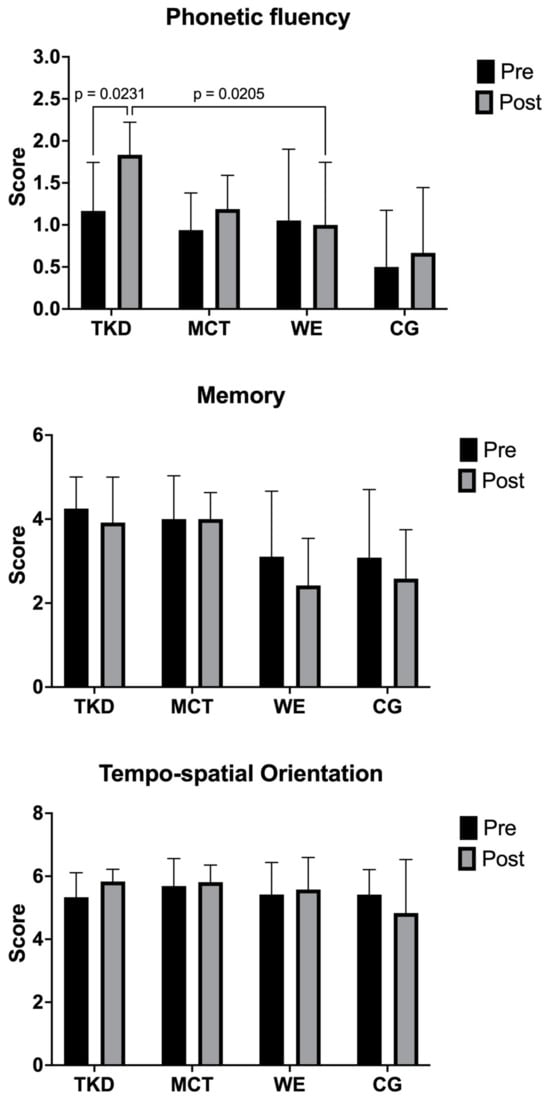 The two-way mixed ANOVA test revealed a significant time × group interaction only for phonetic fluency (F(3,55) = 3.17; p = 0.046; ηp2 = 0.147, large effect), where an increase in the TKD group was observed after the intervention (p = 0.023; ES = 1.35, large effect) and significant differences when comparing the TKD vs. WE groups (p = 0.021; ES = 1.89, large effect) (Figure 3). For the dimensions of memory (F(3,55) = 0.98; p = 0.419; ηp2 = 0.047, small effect) and tempo-spatial orientation (F(3,55) = 1.28; p = 0.288; ηp2 = 0.052, small effect), no significant time × group interaction was observed.