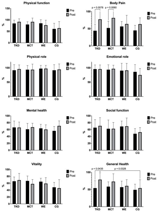 Table 1 shows the HRQoL dimensions before and after intervention results for TKD, MCT, WE, and CG. The two-way mixed ANOVA test revealed a significant time × group interaction for body pain (F(3,55) = 3.31; p = 0.041; ηp2 = 0.122, large effect) and general health (F(3,55) = 2.27; p = 0.007; ηp2 = 0.084, large effect). Multiple comparisons of these results are presented in Figure 4. In body pain, significant increases in HRQoL were found in both the TKD (p = 0.008; ES = 1.46, large effect) and MCT (p = 0.006; ES = 0.80, large effect) groups, while intergroup comparisons revealed no differences between interventions. On the other hand, in general health, an increase in HRQoL was evidenced in the TKD group (p = 0.044; ES = 1.18, large effect). In the intergroup comparison, a difference was observed between TKD and CG (p = 0.033; ES = 1.11, large effect).