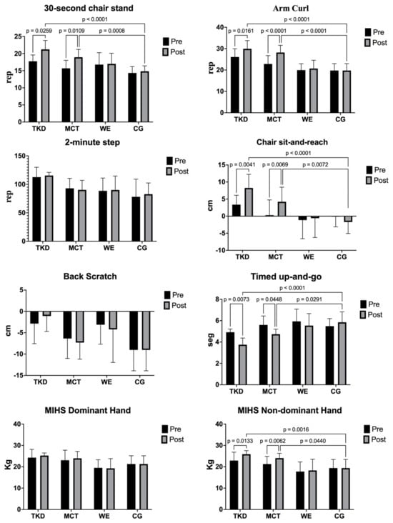 The intergroup comparison revealed significant differences between TKD and CG in the 30 s chair stand (p < 0.001; ES = 3.01, large effect), arm curl (p < 0.001; ES = 2.87, large effect), chair sit-and-reach (p < 0.001; ES = 2.69, large effect), TUG (p < 0.001; ES = 2.42, large effect), and MIHS non-dominant hand (p = 0.002; ES = 2.08, large effect) tests. Similarly, significant differences between MCT and CG were observed in the 30 s chair stand (p < 0.001; ES = 2.54, large effect), arm curl (p < 0.001; ES = 3.01, large effect), chair sit-and-reach (p = 0.007; ES = 1.52, large effect), TUG (p = 0.029; ES = 1.39, large effect), and MIHS non-dominant hand (p = 0.044 ES = 1.42, large effect) tests.