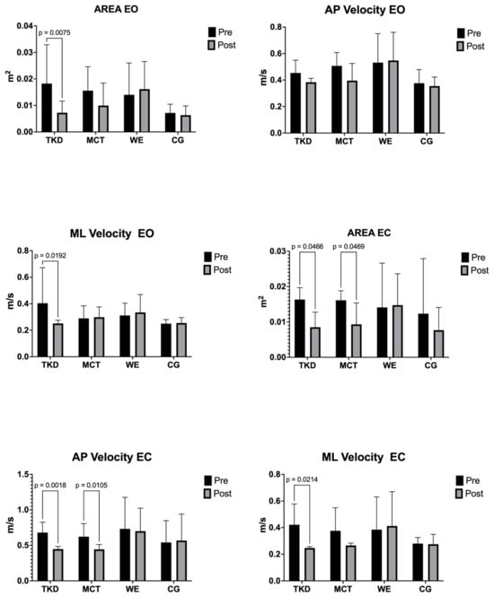 The results of the multiple intragroup and intergroup comparisons are shown in Figure 6. After the intervention in EO, an improved postural balance was observed only in the TKD group in the area (p = 0.008; ES = 1.00, large effect) and the mediolateral velocity (p = 0.019; ES = 0.79, medium effect). In the EC area, postural balance was improved in the TKD (p = 0.047; ES = 1.97, large effect) and MCT (p = 0.047; ES = 1.47, large effect) groups. Likewise, in anteroposterior velocity EC, both the TKD (p = 0.002; ES = 2.16, large effect) and MCT (p = 0.011; ES = 1.28, large effect) groups experienced an improvement in postural balance. Finally, only a significant improvement was found in the TKD group for mediolateral velocity EC (p = 0.021; ES = 1.57, large effect). No significant differences were detected between the training groups.