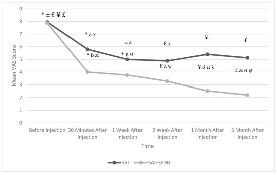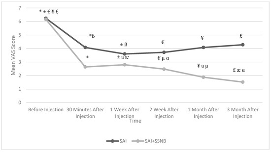 Change in mean moving VAS scores in both groups according to follow-up time. SAI: Subacromial Injection, SSNB: Suprascapular Nerve Block, VAS: Visual Analog Scale * Before Injection vs. 30th min. (p < 0.01), ± Before Injection vs. 1st week (p < 0.01), € Before Injection vs. 2nd week (p < 0.01), ¥ Before Injection vs. 1st month (p < 0.01), £ Before Injection vs. 3rd month (p < 0.01), a 30th min. vs. 1st week (p < 0.05), x 30th min. vs. 2nd week (p < 0.05), ß 30th min. vs. 1st month (p < 0.01), æ 30th min. vs. 3rd month (p < 0.05), µ 1st week vs. 1st month (p < 0.01), α 1st week vs. 3rd month (p < 0.01), λ 2nd week vs. 1st month (p < 0.05), ψ 2nd week vs. 3rd month (p < 0.01).