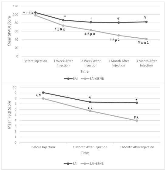 Change in mean “SPADI” and “PSQI” scores according to follow-up time in both groups. SPADI: Shoulder Pain and Disability Index, PSQI: Pittsburgh Sleep Quality Index, SAI: Subacromial Injection, SSNB: Suprascapular Nerve Block. * Before Injection vs. 1st week (p < 0.01), ± Before Injection vs. 2nd week (p < 0.01), € Before Injection vs. 1st week (p < 0.01), ¥ Before Injection vs. 3rd month (p < 0.01), £ 1st week vs. 2nd week (p < 0.01), ß 1st week vs. 1st month (p < 0.01), æ 1st week vs. 3rd month (p < 0.01), µ 2nd week vs. 1st month (p < 0.01), α 2nd week vs. 3rd month (p < 0.01), λ 1st month vs. 3rd month (p < 0.01).