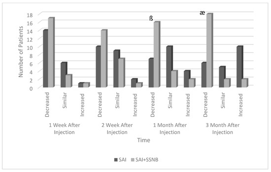 Change in analgesic drug use of patients according to follow-up time in both groups. SAI: Subacromial Injection, SSNB: Suprascapular Nerve Block. ß the difference in the first month after injection is statistically significant (p < 0.05), æ the difference in the third month after injection is statistically significant (p < 0.01).