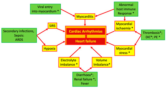 Possible mechanisms of cardiac arrhythmias in COVID-19. Asterisk indicates the influence of ACE system imbalance. Abbreviations: ACE: angiotensin converting enzyme; ARDS: acute respiratory distress syndrome; DIC: diffuse intravascular coagulation; PE: pulmonary embolism; SIRS: systemic inflammatory response syndrome.