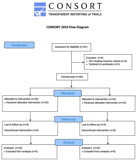 A total of 90 participants were recruited and randomly assigned to one of the two groups, with 84 individuals completing this study (Figure 1).
