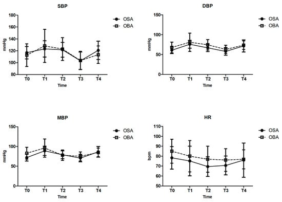 Both groups maintained stable intraoperative hemodynamics, with no significant differences in blood pressure or heart rate at predefined time points (Figure 2). The incidence of hypotension was 54.8% in the OBA group and 42.9% in the OSA group (p = 0.383), while bradycardia occurred in 54.8% of the OBA group and 52.4% of the OSA group (p = 1.000), showing comparable rates between the two groups. Rescue interventions, including ephedrine and atropine administration, were required with similar frequency in both groups (Table 3).