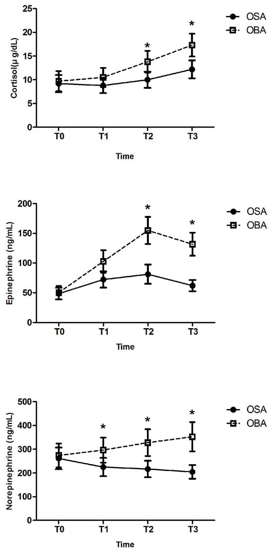 Perioperative stress hormone levels, measured at the baseline, the time of incision, after the pectus bar flip, and immediately after surgery, showed that both groups experienced an increase in cortisol, epinephrine, and norepinephrine during surgery (Figure 3). However, the OSA group showed a smaller increase in epinephrine, with an insignificant decrease in norepinephrine, suggesting attenuated sympathetic activation. Notably, epinephrine levels peaked in both groups at the time of the pectus bar flip, although the OFA group showed a significantly lower peak compared to the OBA group. Cortisol secretion also increased continuously in both groups, but the OSA group demonstrated a more attenuated increase following DEX infusion, resulting in a significant difference between the two groups.