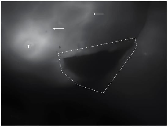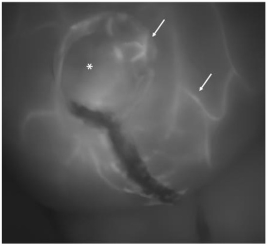 Another image of a breast at the completion of the procedure: the asterisk indicates a skin perforator vessel from which several small tangential vessels branch out (white arrows). This pattern is characteristic of a well-perfused skin flap.