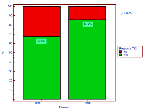 Ustekinumab showed greater efficacy in achieving the primary outcome, with 85.7% of patients responding at T12 versus 67.5% with vedolizumab (OR 2.89, CI 1.10–7.6, p = 0.03) (Figure 1).