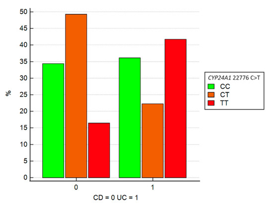 Additionally, we assessed another polymorphism in CYP24A1, 22776 C>T, but no significant associations were observed for our predefined outcomes, consistent with a previous study on adalimumab [10]. However, we found an association between the CT genotype and CD vs. UC, with a p-value of 0.009 (OR 3.74, 95% CI: 1.35–8.52), indicating that carriers of the CT genotype have approximately three times the likelihood of developing CD compared to UC.