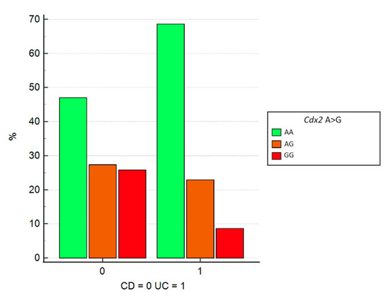 We also analyzed the A>G polymorphism in the Cdx2 gene, which encodes the VDR. This gene activates transcription factors that stimulate genes involved in immune homeostasis, metabolism, absorption of ions such as calcium and phosphorus, and the apoptotic mechanism. In our study, the homozygous GG genotype was associated with an approximately threefold increased likelihood of developing CD compared to UC (OR 3.74, 95% CI: 1.02–13.77, p = 0.047). Existing literature already indicates a correlation between Cdx2 SNPs and the onset of inflammatory bowel disease [25]. However, there is no significant evidence linking Cdx2 specifically to one type of IBD over another.