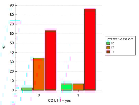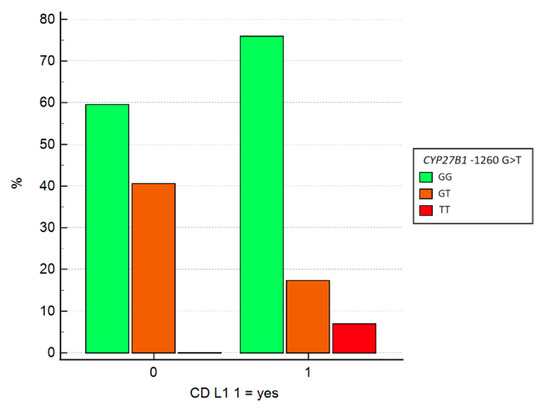 Lastly, we explored the potential correlation between genotypes and ileal involvement in CD (L1). Chi-square tests indicated that CD localization varies according to CYP27B1 gene genotypes. Specifically, analysis of SNPs at positions −1260 (G>T) and +2838 (C>T) in the CYP27B1 gene revealed statistically significant associations, with p-values of 0.047 and 0.025, respectively.