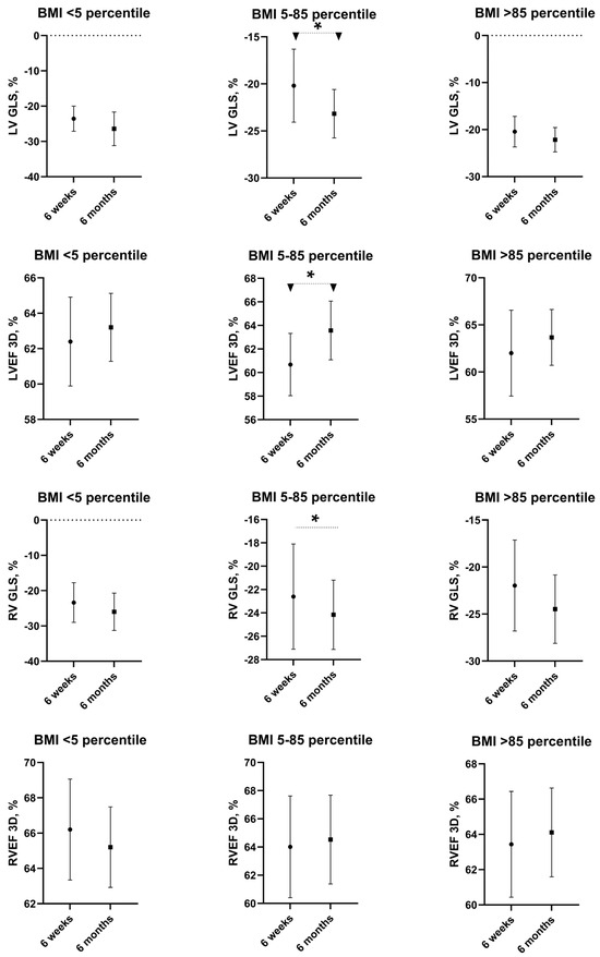 During follow-up, 130 children were evaluated after 6 weeks and 72 were evaluated again after 6 months. For all children, despite their weight status, the means of left and right ventricular ejection fraction (LVEF and RVEF) in 3D-ECHO and average GLS were reported to be within normal limits at the time of both check-up points (Table 1). However, in children with normal weight, the function of the left ventricle improved further between 6 weeks and 6 months according to both GLS and LVEF (p < 0.05). No significant improvement in left ventricle function was observed in underweight, overweight and obese children between 6 weeks and 6 months according to both GLS and LVEF (Table 1, Figure 1).