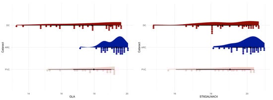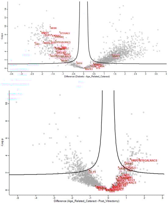 27]. In the present study, ST3GAL5 was significant in the anterior capsule samples of the ARC group compared to both the DC and PVC groups, and it could be hypothesized that they are particularly implicated in cataract formation by modifying cell membranes and cell-to-cell interactions. In particular, altered proteoforms of ST3GAL5, which is responsible for the formation of GM3 ganglioside, may affect its activity, leading to the disrupted synthesis of gangliosides including GM3 and may impair lens fiber cell membrane integrity and intercellular communication, contributing to lens opacification.