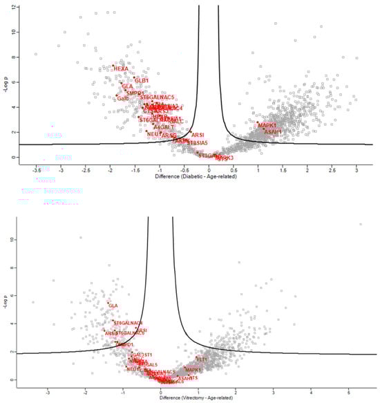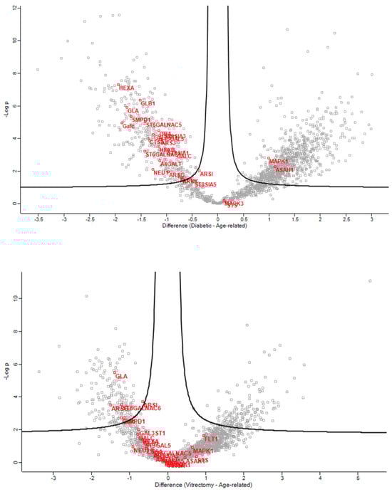 29]. It was found to be significant in the ARC group compared to the DC and PVC groups in phaco cassette samples. GLA is associated with the breakdown of glycolipids, preventing their accumulation in the lens, thus maintaining lens transparency. In the present study, GLA was significantly different in the ARC group compared to the DC and PVC groups in phaco cassette content samples. An interpretation of these results would suggest a possible increased activity secondary to increased glycolipid metabolism. A hypothesis would be that with age, once a certain threshold of GLA activity is surpassed, lens opacification and ARC may occur, likely secondary to increased glycolipid metabolism. Another hypothesis would be that elevated GLA activity may lead to the excessive breakdown of glycolipids, resulting in the accumulation of metabolic byproducts such as ceramides or other sphingolipid intermediates in the lens. Regarding ST3GAL5, which is responsible for the formation of GM3 ganglioside, altered proteoforms of it could affect its activity, leading to disrupted synthesis of gangliosides, including GM3, and may impair lens fiber cell membrane integrity and intercellular communication, contributing to lens opacification. The changes in protein species related to glycolipid and glycosphingolipid pathways may highlight the proteome’s dynamic shifts during cataract progression and support the hypothesis that these alterations contribute to the structural and functional changes leading to ARC. The complexity of the proteome in the lens, in relation to these glycolipid-related processes, suggests that the diversity in proteoforms and protein species may play a crucial role in mediating the pathological changes associated with ARC. The intricate proteome complexity in the lens underscores the need to investigate not just individual protein species but their interactions and modifications during aging and cataract development.