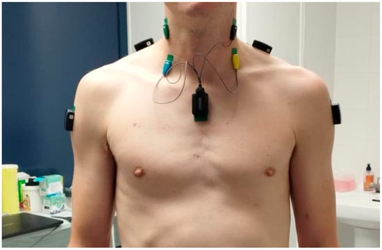 Example of surface electrode placement in deltoid, upper trapezius, anterior scalenus, and sternocleidomastoid, bilaterally.