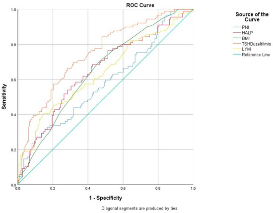 To evaluate the usefulness of the PNI, HALP score, and other clinical–laboratory variables in distinguishing HG, ROC curves were calculated and are shown in Table 6. The HALP score had an AUC of 0.625 (95% CI: 0.586–0.664), with the optimal cut-off value set at 35.8, resulting in a sensitivity of 59.7% and a specificity of 59.5% (p < 0.001). Similarly, the PNI score showed an AUC of 0.580 (95% CI: 0.541–0.619), and the optimal cut-off value was set at 50.6, resulting in a sensitivity of 54.9% and a specificity of 54.9% (p < 0.001). Also, the AUC for BMI was 0.643 (cut-off: 27.5 kg/m2, 95% CI: 0.576–0.711, p < 0.001, sensitivity: 68.9%, specificity: 53.8%); for ALT, it was 0.547 (cut-off: 12 U/L, 95% CI: 0.507–0.586, p = 0.021, sensitivity: 57.3%, specificity: 49.1%); for AST, it was 0.588 (cut-off: 16.9 U/L, 95% CI: 0.549–0.627, p < 0.001, sensitivity: 61.1%, specificity: 53.3%); for TSH, it was 0.704 (cut-off: 1.15 mU/L, 95% CI: 0.667–0.740, p < 0.001, sensitivity: 66.2%, specificity: 65.1%); for hemoglobin, it was 0.569 (cut-off: 12.9 g/dL, 95% CI: 0.530–0.608, p = 0.001, sensitivity: 58.2%, specificity: 52.1%); for lymphocyte count, it was 0.637 (cut-off: 1.73 × 103/μL, 95% CI: 0.599–0.675, p < 0.001, sensitivity: 60.7%, specificity: 60.2%); and for platelet count, it was 0.549 (cut-off: 259.5 × 103/μL, 95% CI: 0.509–0.588, p = 0.016, sensitivity: 54.6%, specificity: 53.8%) (Figure 1 and Figure 2).