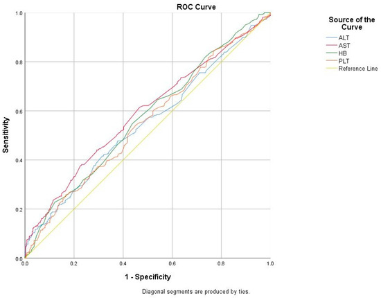 Receiver operating characteristic (ROC) curves to assess the usefulness of ALT, AST, hemoglobin, and platelet count.