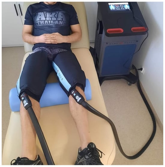 The effectiveness of contrast water therapy and the satisfaction of coaches and athletes have prompted clinicians to look for new tools for stimulating the muscular system. One of them is Game Ready (GR) (An Avanos Medical, Inc., Company, 5405 Windward Pkwy, Alpharetta, GA, USA). This system can serve as local monotherapy with cold, heat, contrast therapy, or all these stimuli combined with pressure in one session [28,29]. GR therapy is applied to the chosen body area with a pressure cuff, which makes it an easy-to-use, mobile, and time-saving procedure. Pressure is regulated to range from 15 to 75 (mmHg) (2–10 kPa), and the temperature ranges from 3 to 45 °C. Therapy time is regulated from 5 to 30 min [20,24].