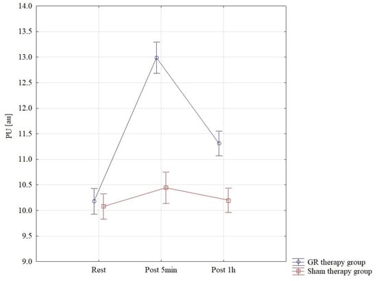 The results of the analysis of variance for PU (perfusion unit) allowed for the finding of significant differences for the pre–post*therapy interaction F = 67.70; p < 0.001; η2 = 0.71. Significant differences were found between all interactions p < 0.001 in the GR therapy group. The GR therapy group found the highest PU results, measured 5 min after therapy, M = 12.99 ± 0.63, and they were statistically significantly higher than those in the sham therapy group at 5 min of therapy M = 10.45 ± 0.53. In the GR group, PU one hour after therapy, M = 11.31 ± 0.45, was statistically significantly higher than that in the sham therapy group M = 10.20 ± 0.46 p < 0.001. These results are also confirmed by Figure 4.